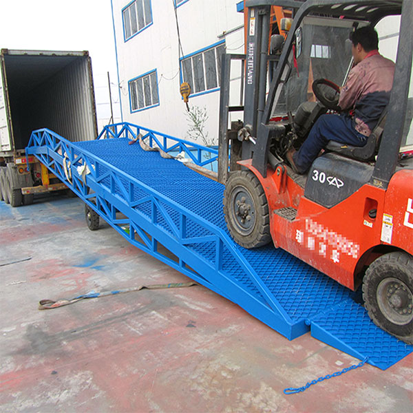 移動(dòng)登車橋是實(shí)現(xiàn)貨物快速裝卸的專用輔助設(shè)備,它的高度調(diào)節(jié)功能使貨車與庫房的貨臺(tái)之間架起一座橋梁,叉車等搬運(yùn)車輛通過它能直接駛?cè)胴涇噧?nèi)部進(jìn)行貨物的批量裝卸,僅需單人作業(yè),即可實(shí)現(xiàn)貨物的快速裝卸。移動(dòng)液壓登車橋使企業(yè)減少大量勞力,提高工作效率,獲取更大經(jīng)濟(jì)效益。臺(tái)面均設(shè)計(jì)為網(wǎng)格狀鋼板,這種結(jié)構(gòu)能保證具有很好的強(qiáng)度,又具有防滑功能,還能方便地清掃工作臺(tái)面,使它能經(jīng)常地保持清潔、美觀。移動(dòng)液壓登車橋無須外接電源,通過手搖泵做動(dòng)力能輕松地在其整個(gè)調(diào)整范圍內(nèi)按50mm的倍數(shù)進(jìn)行高度的調(diào)整??梢猿浞诌m應(yīng)各種不同高度的貨車.