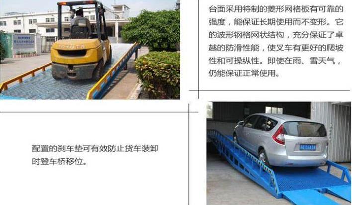 功能:方便卸貨,穩(wěn)定性強(qiáng),維修成本低。適用于裝卸場(chǎng)地上各種車(chē)輛以及交通相對(duì)繁忙的場(chǎng)所。 裝卸平臺(tái)、升降平臺(tái)、卸貨平臺(tái): 防溜車(chē)裝置:該裝置是由鋼板焊接而成的,可有效地實(shí)現(xiàn)防滑的功能。